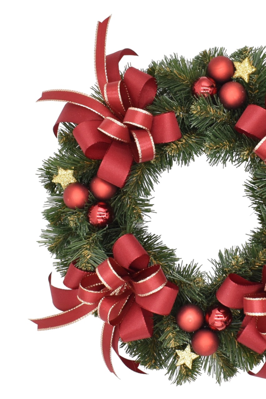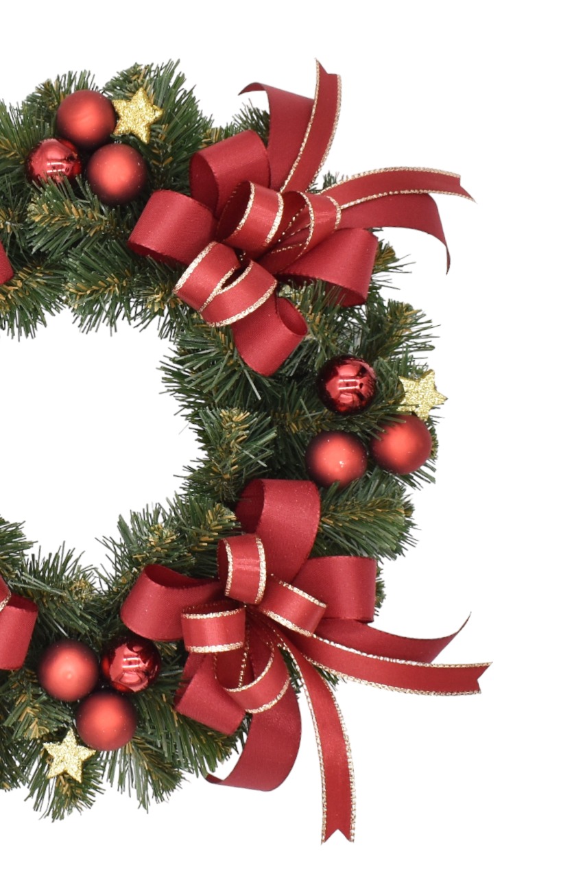 Der stilvolle, dekorative Adventskranz in traditionellen Farben wird Ihre Weihnachtsdekoration perfektionieren. Dieser Weihnachtskranz hat dicke, gut verarbeitete PVC-Nadeln in Grün, die durch geschmackvolle Ornamente in Rot und Gold und ebenso stilvolle rote Schleifen ergänzt werden.