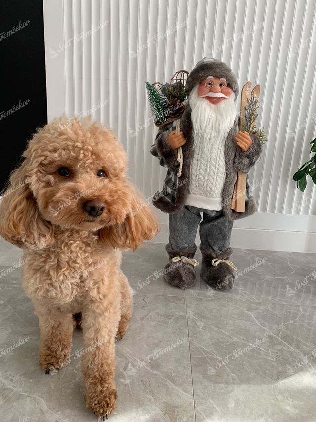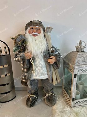 Der graue Santa Claus ist detailliert verarbeitet. Sein realistisches Gesicht ist mit einer runden Brille und einem dicken weißen Kinn verziert. In seinen Händen hält er stilvoll Geschenke, Zweige oder Ski.