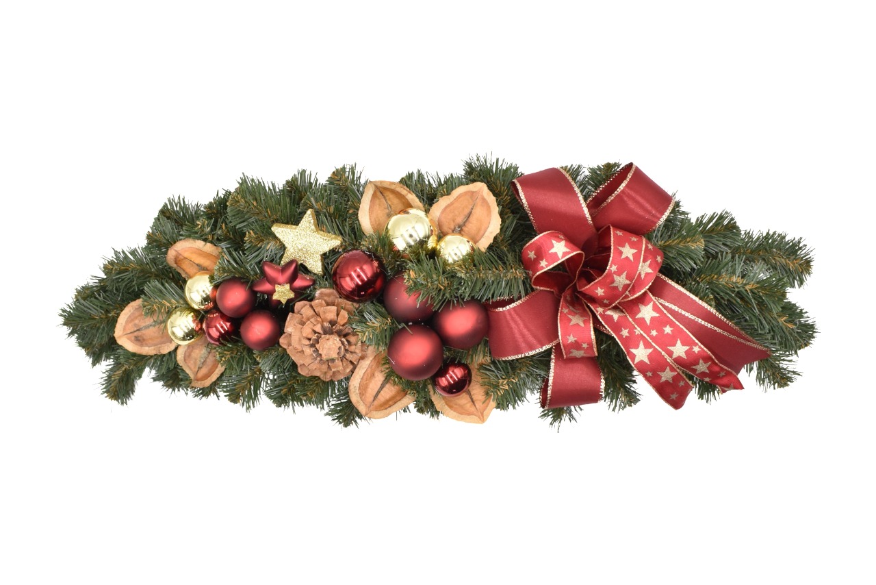 Die Girlande in der Mitte des Tisches ist geschmackvoll in rot-goldenen Tönen gehalten. Sie wird dominiert von Weihnachtskugeln in Gold und Rot und einer klobigen rot-goldenen Schleife. Mit dieser Weihnachtsdekoration verschönern Sie garantiert Ihre Weihnachtstafel. Die Länge der Girlande beträgt 60 cm.