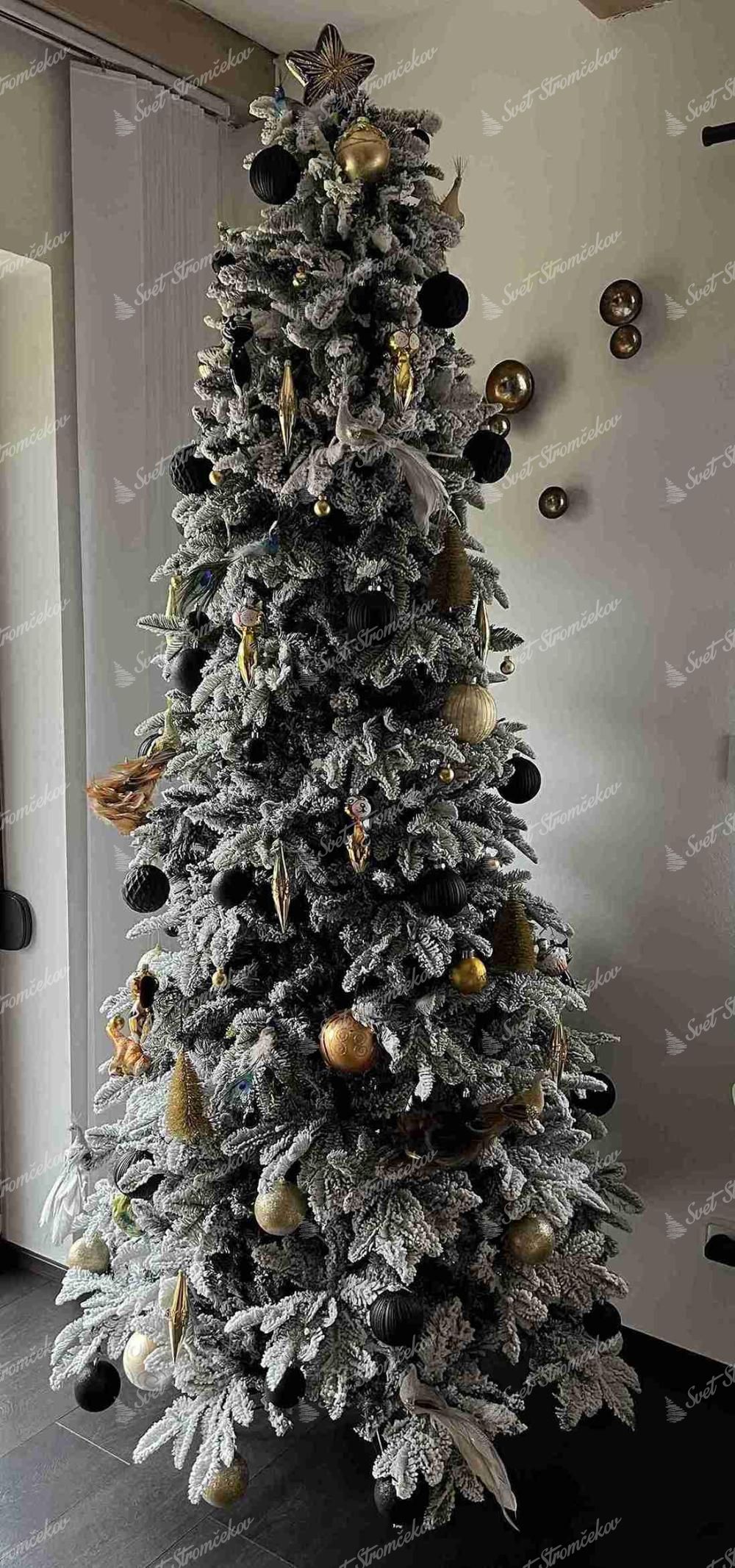 Ein moderner Weihnachtsbaum mit einem schmalen Design, die 3D Iberische Tanne mit Kunstschnee LED ist eine Neuheit für die Saison 2024. Das originelle Aussehen des Baumes entsteht durch die zarten und unregelmäßig verschneiten Zweige, die einen frisch verschneiten Baum in der Natur imitieren. Das Innere des Baums wird durch schneebedeckte klassische PVC-Zweige ergänzt, die ihm ein dichtes Aussehen verleihen.