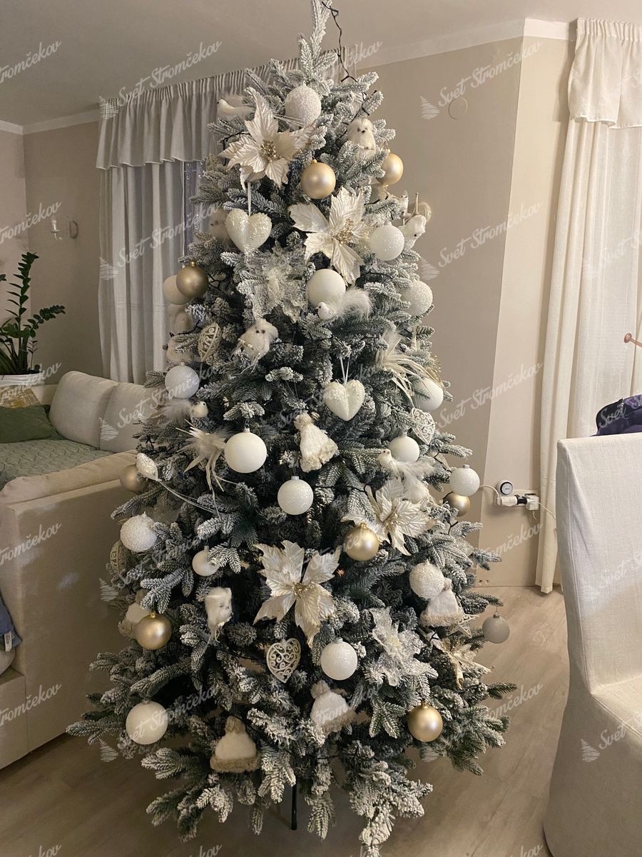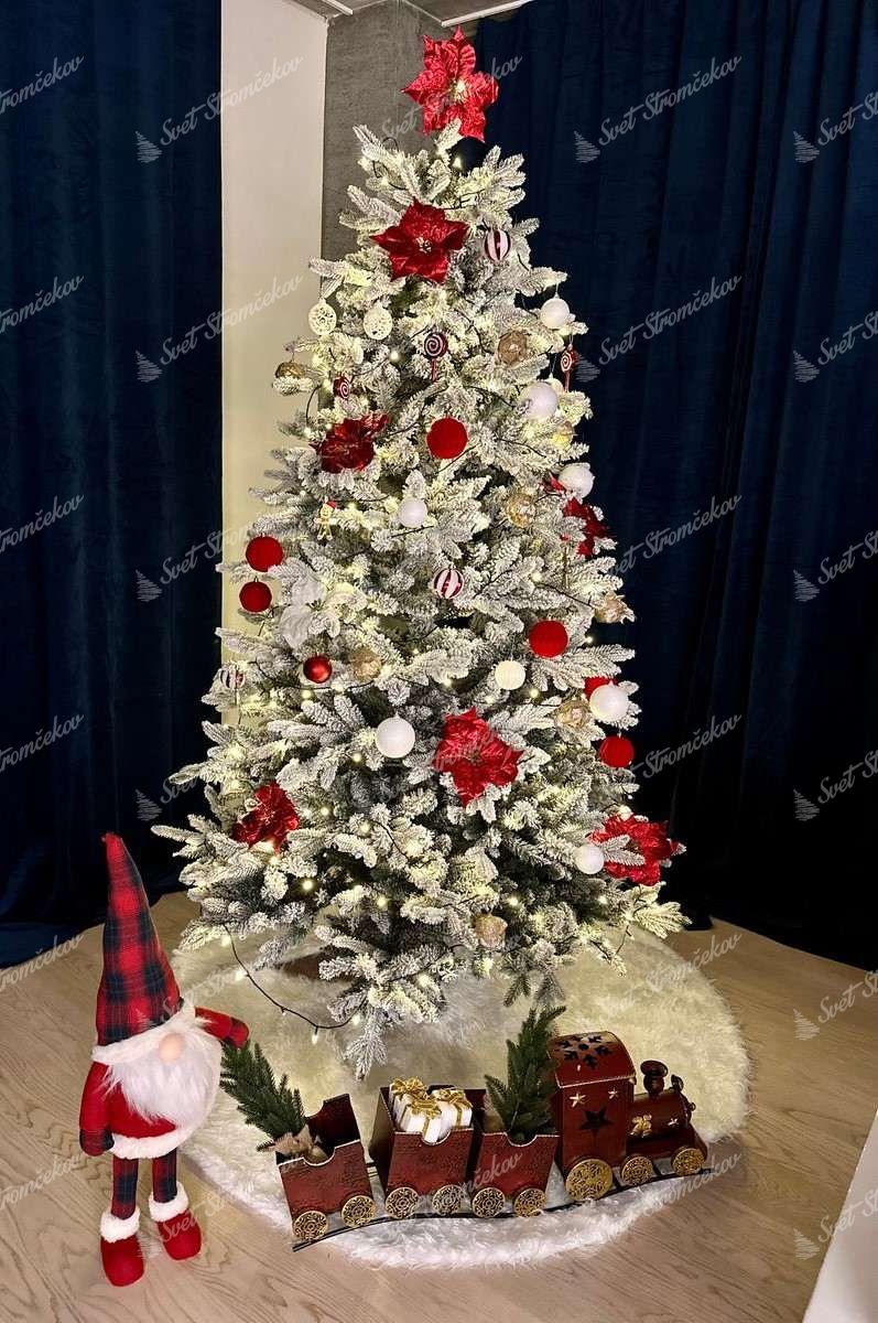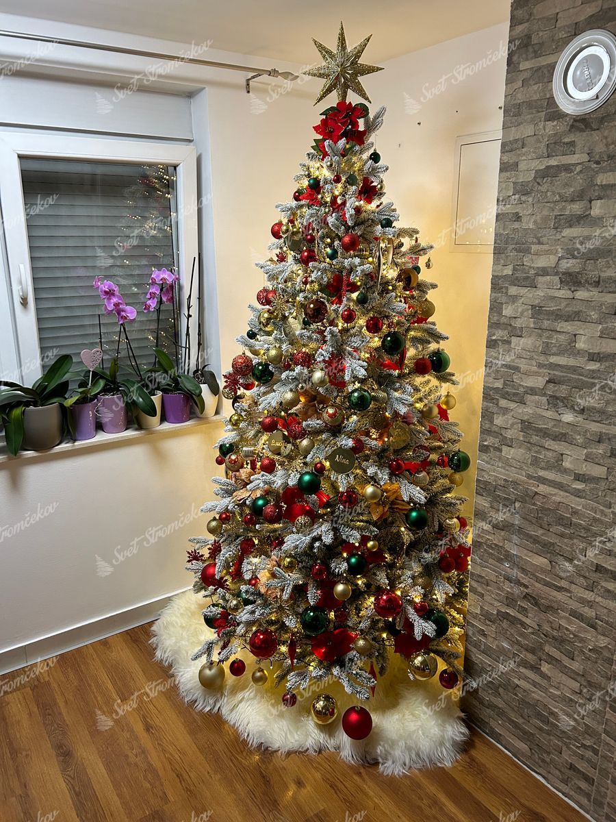 Die 3D-Nadeln um den gesamten Umfang des Baumes werden durch klassische PVC-Nadeln ergänzt, die dicht beschneit sind. Die moderne Applikation von einem Kunstschnee auf den Baum garantiert, dass der künstliche Schnee nicht abfällt. Der Baum besteht aus einer festen Eisenkonstruktion und ein stabiler Metallständer ist Bestandteil der Verpackung.