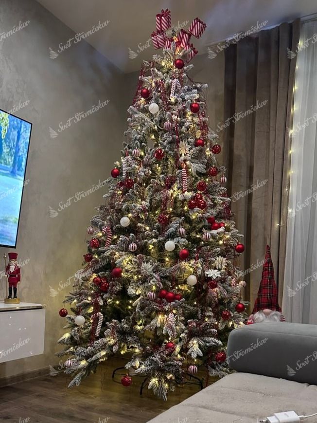 Die 3D-Zweige werden durch klassische PVC-Zweige, die mit Kunstschnee beschneit sind, ergänzt, wodurch der Baum dichter wirkt. Das neueste Anwendungssystem garantiert, dass kein Kunstschnee von den Bäumen fällt. Der Baum besteht aus einer festen, stabilen Eisenkonstruktion und wird mit einem Metallständer geliefert. Für die perfekte Form des Baumes sorgt ein Regenschirm-Faltsystem, das die einzelnen Zweige an eine vorbestimmte Stelle platziert.