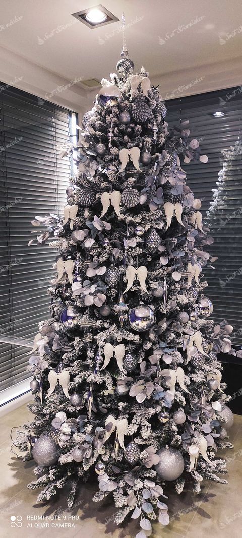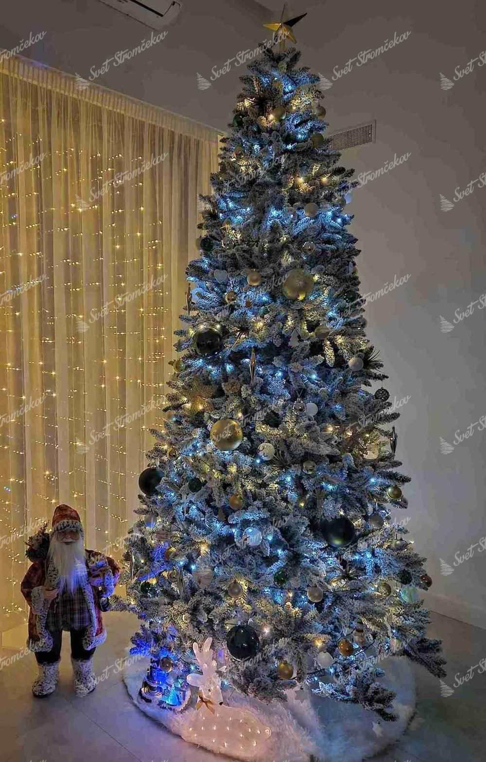Weißer Weihnachtsbaum, Höhe 240cm, Breite 137cm, dicht verschneite Nadeln, Nadeltyp – PVC, Design – dicht, Spitzenlänge – 10cm, Anzahl der LED-Dioden – 700, Farbe der LED-Dioden – warmweiß, 8 Beleuchtungsmodi, Anzahl der Teile – 2