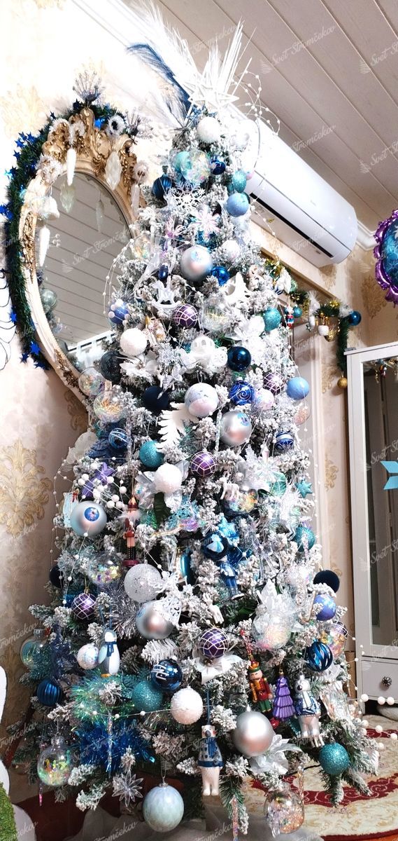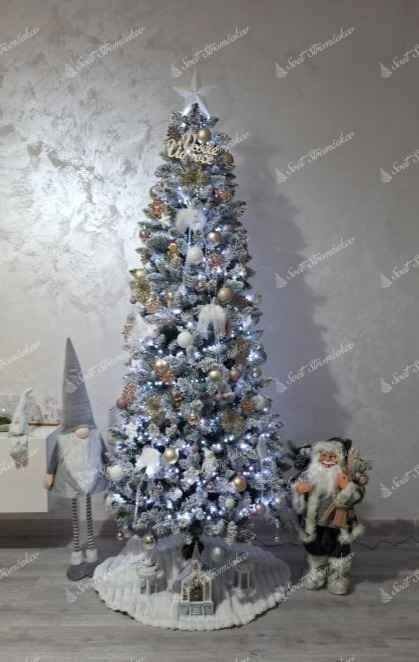 Der Baum besteht aus hochwertigen PVC-Kiefernzweigen in naturgetreuer grüner Farbe, die dicht mit künstlichem Schnee bedeckt sind. Der Schnee wird mit modernster Technik auf die Zweige aufgebracht, so dass der Schnee kaum vom Baum fällt. Beim ersten Aufstellen des Baums fallen noch unbefestigte Schneepartikel herunter.