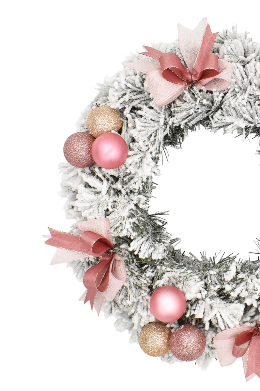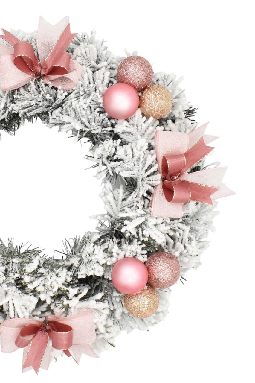 Der verschneite dekorative Adventskranz mit einer dicken Schicht Kunstschnee macht Ihre Weihnachtsdekoration perfekt. Dieser Weihnachtskranz besteht aus dichten, reichlich verschneiten, gut verarbeiteten PVC-Tannennadeln, die durch geschmackvolle Ornamente in hellen Rosatönen, cremefarbene Kugeln und rosa Schleifen ergänzt werden.