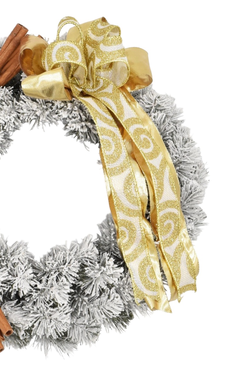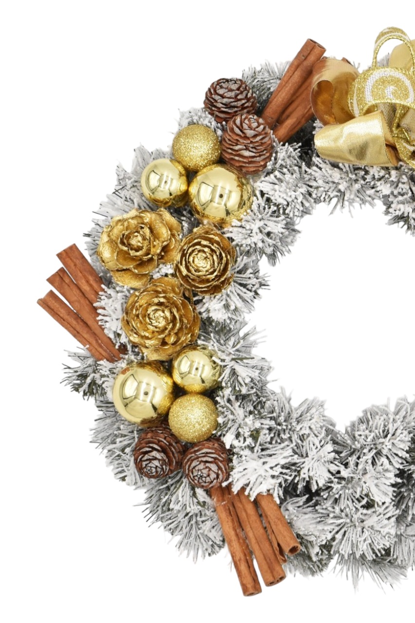 Der verschneite, dekorative Weihnachtstürkranz mit einer dicken Kunstschneeschicht macht Ihre Weihnachtsdekoration perfekt. Dieser Weihnachtskranz besteht aus dicht verschneiten, gut verarbeiteten PVC-Tannennadeln, die durch geschmackvolle goldene Ornamente, Tannenzapfen, Zimt und eine klobige goldene Schleife ergänzt werden.