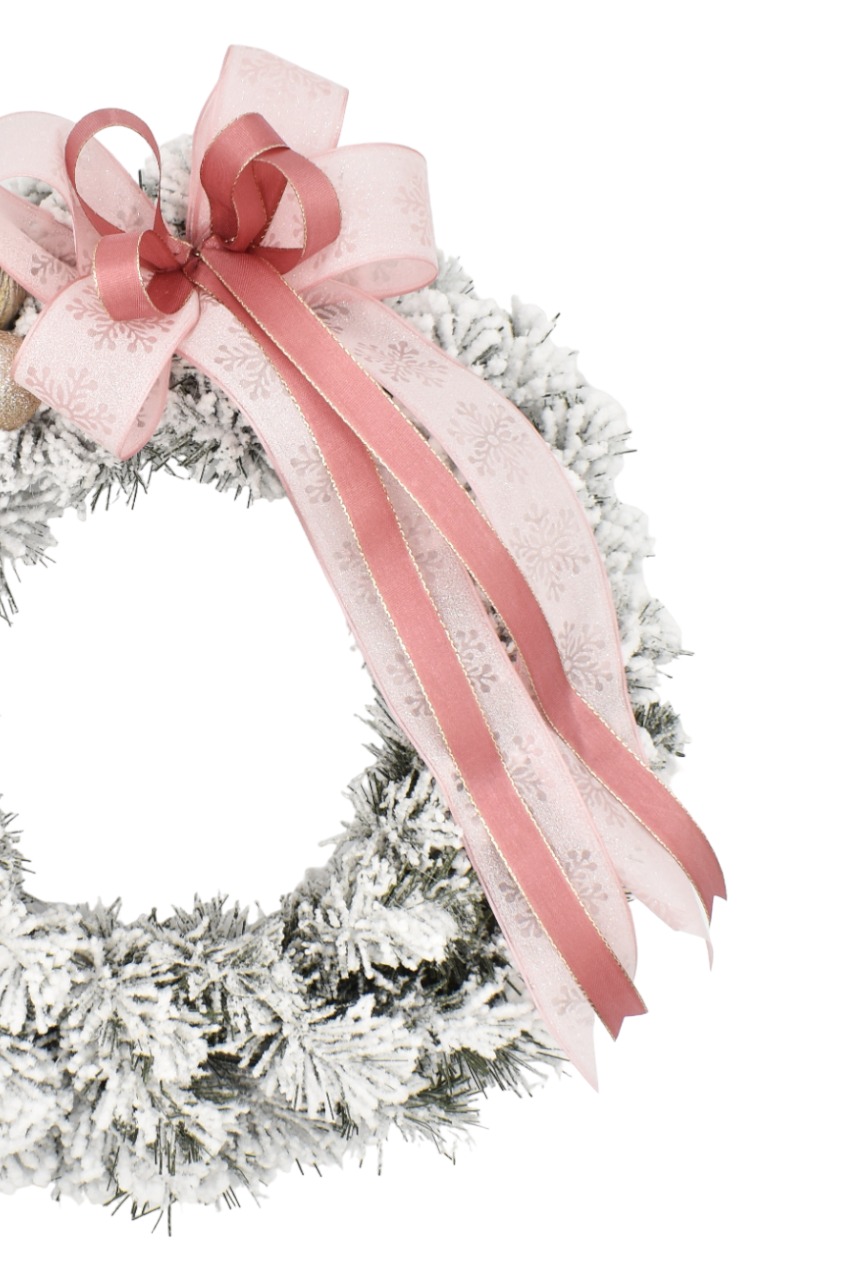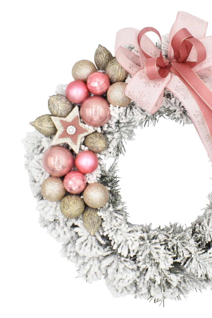 Der verschneite, dekorative Weihnachtstürkranz mit einer dicken Kunstschneeschicht macht Ihre Weihnachtsdekoration perfekt. Dieser Weihnachtskranz besteht aus dichten, reichlich verschneiten, gut verarbeiteten PVC-Tannennadeln, die durch geschmackvolle Ornamente in hellen Rosatönen, cremefarbene Dekorationen und eine klobige, hellrosa Schleife ergänzt werden.