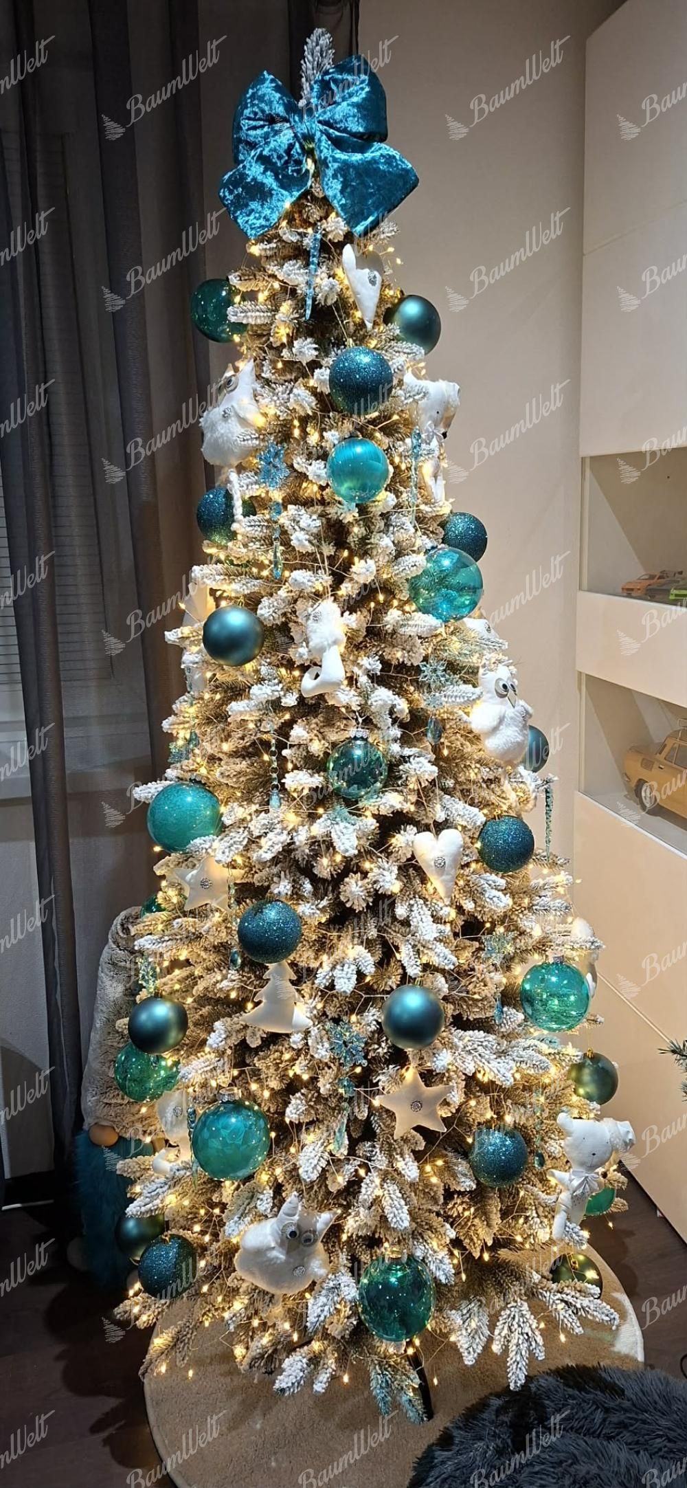 Seine weiß-grünlichen Zweige bezaubern wohl jeden, der sich nach einem eisig majestätischen Weihnachtsfest sehnt. Die 3D-Nadeln werden am gesamten Umfang des Baums durch klassische PVC-Nadeln ergänzt, die dicht zugeschneit sind. Das hochmoderne System zum Aufbringen des Kunstschnees auf den Baum sorgt dafür, dass der Schnee nicht herunterfällt.