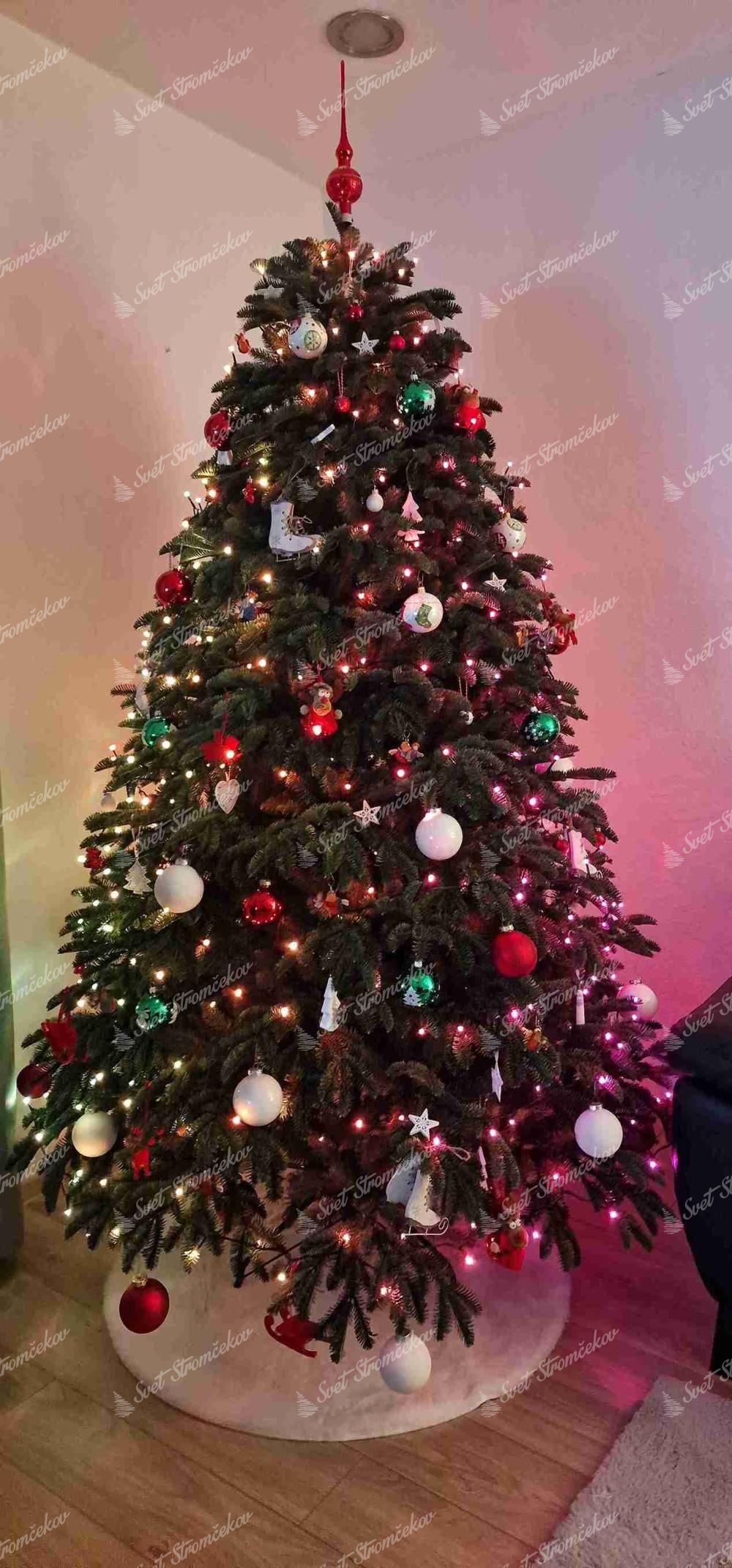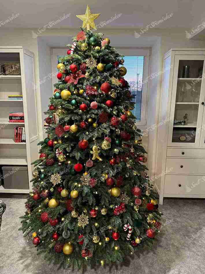 Der Baum ist in der Mitte mit klassischen PVC-Zweigen verdichtet, was ihm ein üppiges und voluminöses Aussehen verleiht. Dieser exklusive Weihnachtsbaum zählt aufgrund seines nächtigen Aussehens und der größeren Abmessungen zur Kategorie der übergroßen XL-Weihnachtsbäume.