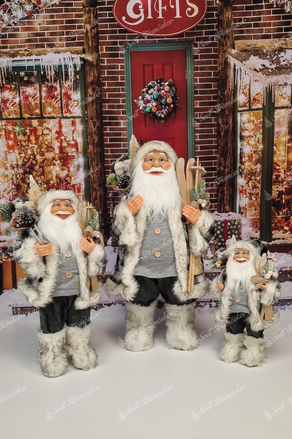 Der graue St. Nikolaus ist detailreich gestaltet. Sein kunstvolles Gesicht ist mit einer runden Brille und einem dichten weißen Bart geschmückt. In seinen Händen hält er stilvoll abgestimmte Accessoires wie einen Sack mit Geschenken, einen Hausschuh und Skier.