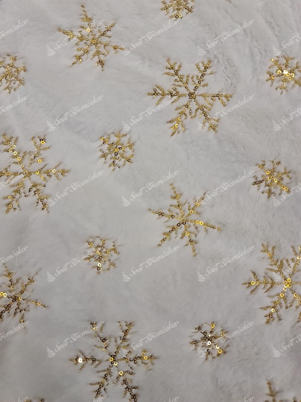 Dieser elegante, weiße Weihnachtsbaumteppich ist mit geschmackvollen goldfarbigen Schneeflocken bestickt. Der Weihnachtsbaumteppich hat eine kürzere Florhöhe und ist dadurch sehr weich.